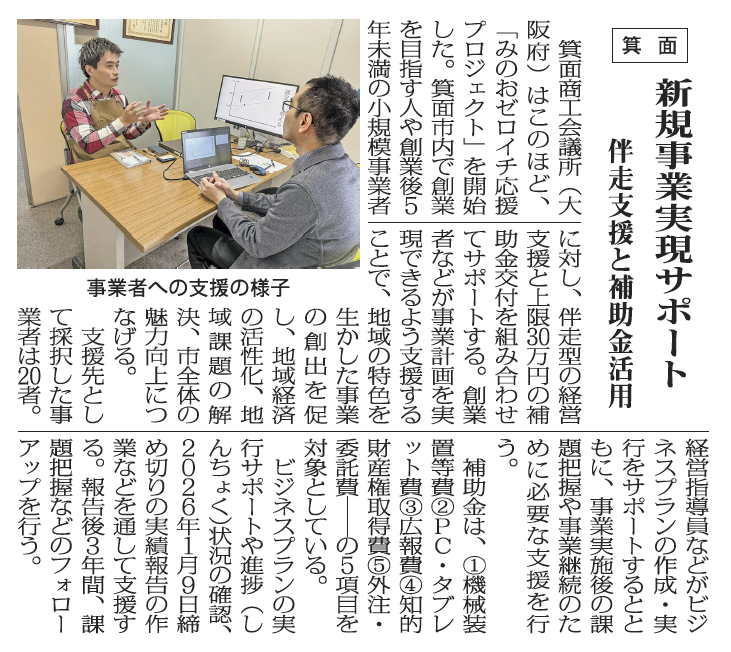 当所が箕面市と連携して、令和7年度から開始した新しい創業支援事業「みのおゼロイチ応援プロジェクト」が、日本商工会議所の全国紙「会議所ニュース」(11月11日号)で紹介されました。